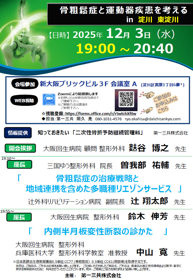 当院院長(曽我部)が、骨粗鬆症(骨粗しょう症)と運動器疾患をテーマとした学術勉強会において座長を担当します。地域の基幹病院・クリニックの先生方と、最新の知見やエビデンスにもとづく治療方針を検討・共有し、骨折予防と機能回復に関する地域医療の質向上を目指します。