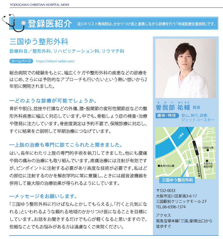 淀川キリスト教病院の広報誌「よどきり便り」Vol.42より当院(三国ゆう整形外科)の紹介記事が掲載されました!地域で切れ目のない医療を実現するため、病診連携をいっそう強化してまいります。