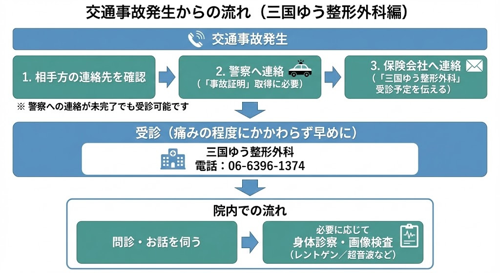 交通事故後の痛みでお困りの方へ。三国ゆう整形外科(阪急三国駅徒歩1分)は、痛みに寄り添い、丁寧に診察・治療を行います。お一人で抱え込まず、まずはご相談ください。自賠責保険の手続きもスタッフがわかりやすくサポートします。WEB予約・お電話で当日受診にも対応。書類や連絡先については、受付へお気軽にご相談ください。