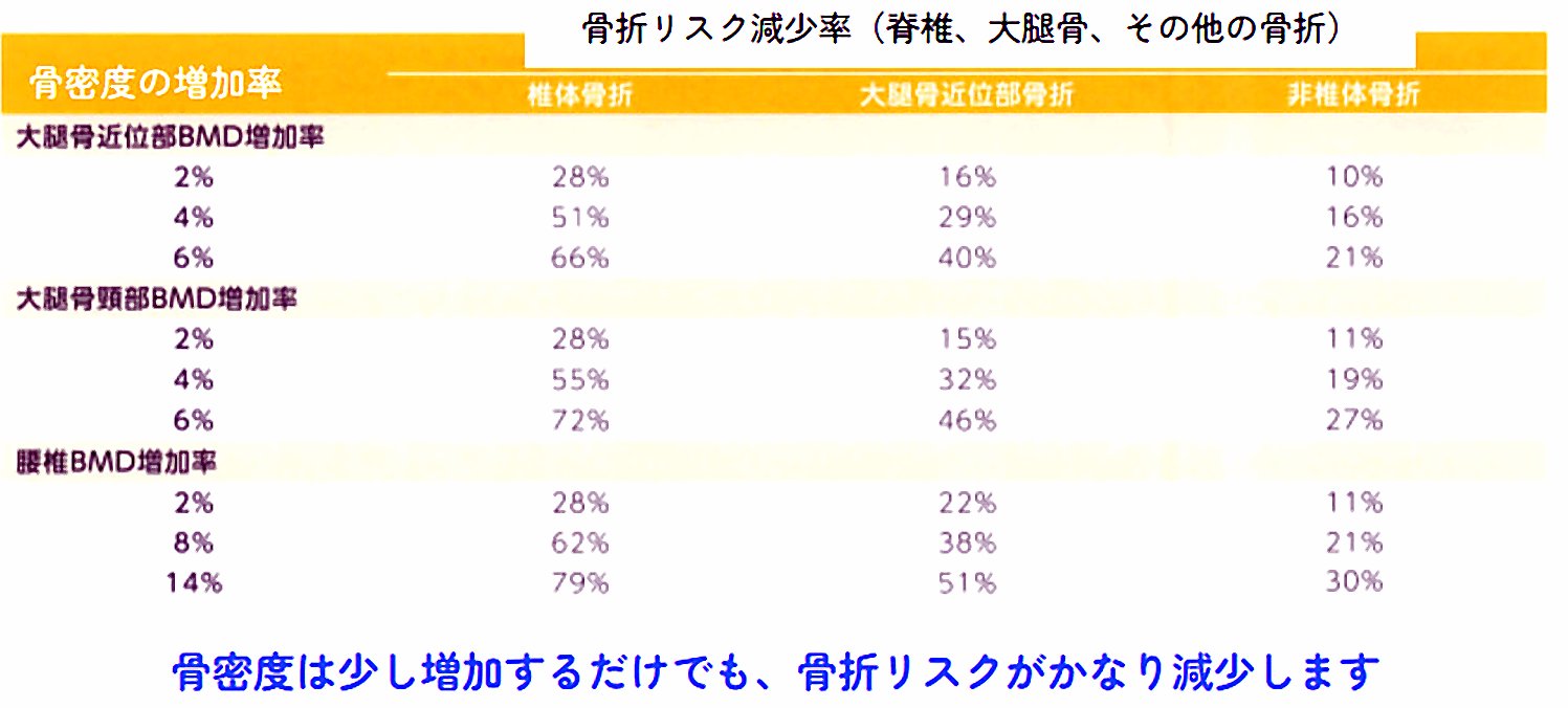 骨密度が上がるほど、将来の骨折リスクは下がります。研究でも、わずかな骨密度の改善であっても、大腿骨(太ももの付け根)などの大きな骨折の予防に役立つことが報告されています。つまり、早めに見つけて、治療で骨密度を少しずつ改善していくことが、とても重要です。