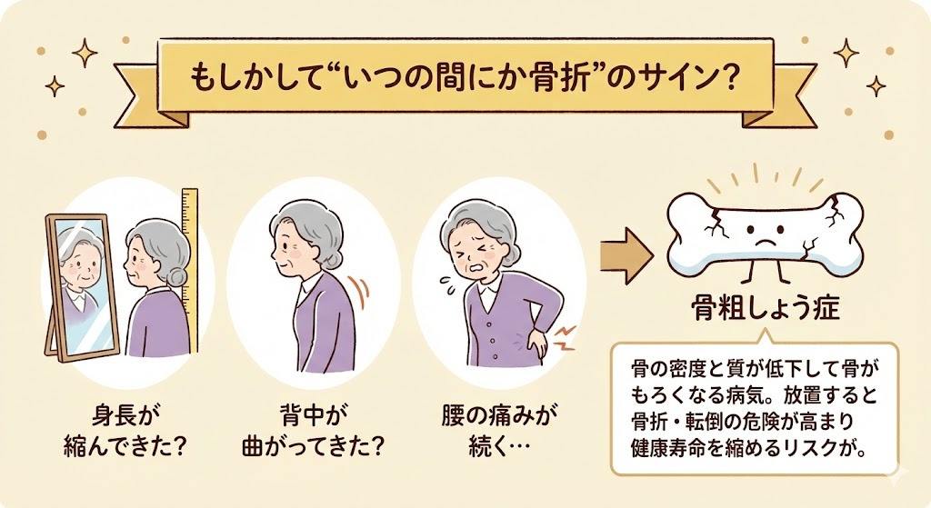 「身長が縮んできた」「背中が曲がってきた」「腰の痛みが続く」——こうした変化は、骨粗しょう症による“いつの間にか骨折”のサインかもしれません。骨粗しょう症は骨の密度と質が低下して骨がもろくなる病気で、放置すると骨折・転倒の危険が高まり、健康寿命を縮めるリスクがあります。逆に、早期発見と対策で将来の骨折は大きく減らせます。
