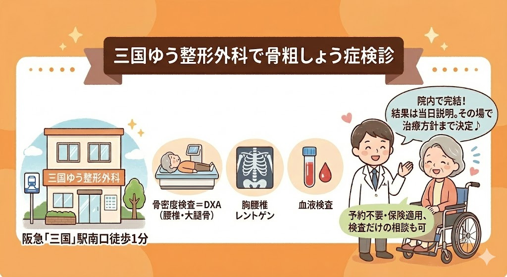三国ゆう整形外科(阪急「三国」駅南口徒歩1分)では骨粗しょう症検診に必要な、骨密度検査=DXA(腰椎・大腿骨)、胸腰椎レントゲン、血液検査を院内で完結。結果は当日説明し、その場で治療方針まで決定できます(予約不要・保険適用、検査だけの相談も可)。