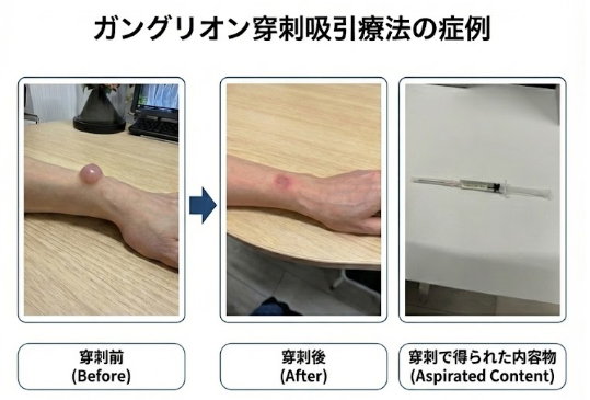 ガングリオンは自然に小さくなる(消退する)こともあるため、まずは「半数程度は自然に改善する可能性がある」ことを説明し、症状が軽い場合は経過観察を提案します。