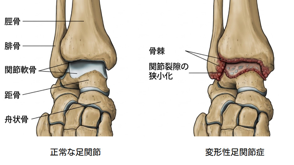 膝や股関節の軟骨がすり減る変形性膝関節症は有名です。同様に、足関節にも軟骨のすり減りにより起こる変形性足関節症があります。関節のクッションの役割を果たす関節軟骨が摩耗、または変性することに始まり、進行すると関節の骨が破壊されていく疾患です。