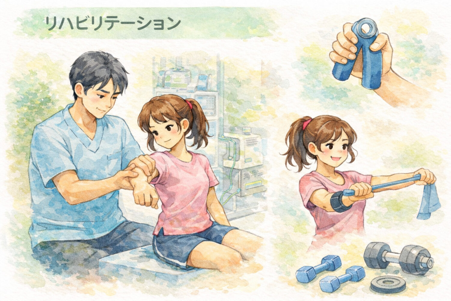 症状の緩和と再発予防の要となるのが理学療法です。痛みが落ち着いてきた段階で、前腕伸筋群のストレッチ(10〜20秒の保持)をゆっくりと開始します。さらに、等尺性運動から始めて痛みに応じ段階的に負荷を上げる筋力トレーニングを導入し、肩甲帯や握力の強化も図ります。また、血流改善や組織の柔軟性を高めるために、物理療法や電気刺激を併用することもあります。