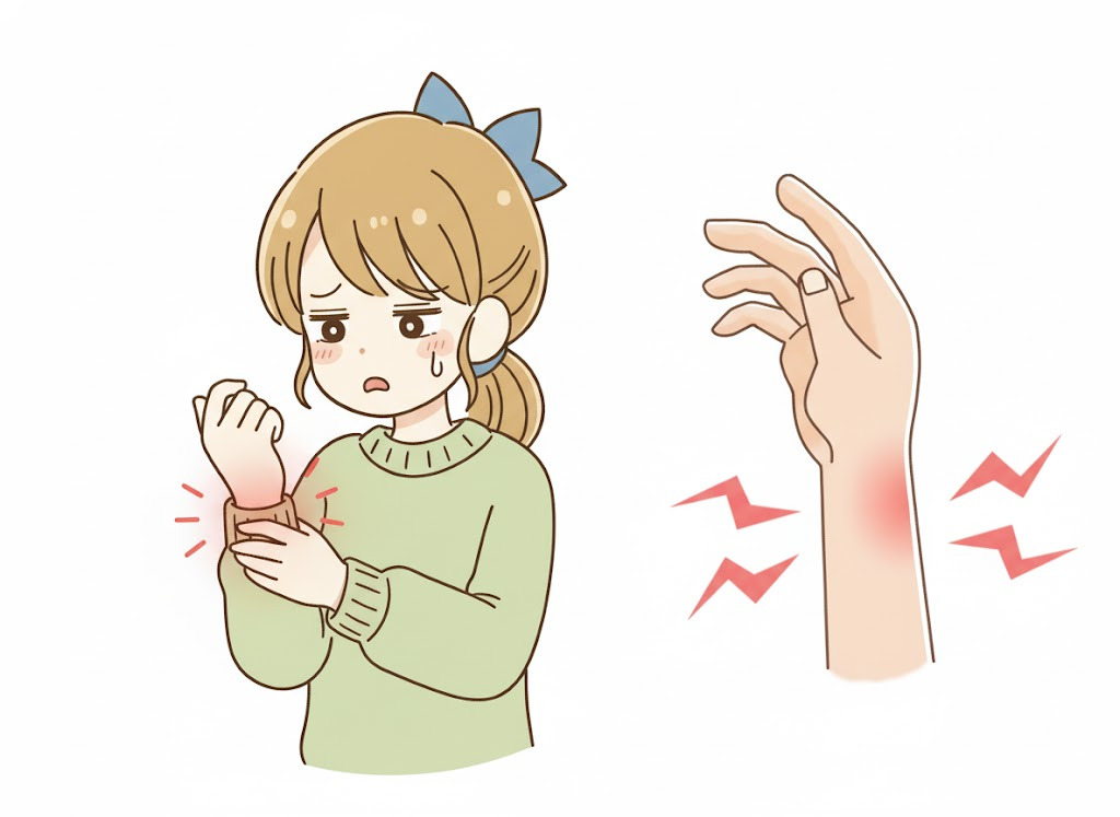 ドケルバン病(手首の腱鞘炎)では、親指の付け根付近(橈骨茎状突起の先端から近位1~2 cm )に痛みや腫れが生じます。つかむ・つまむ・ひねるといった動作で親指や手首が動かしにくくなり、親指を動かすと「引っかかる」「途中で止まる」感じが出ることがあります。放置すると痛みが親指から前腕へ広がったり、動かすたびに痛みが強くなることがあります。診察ではよく「フライパンが振れない」「雑巾が絞れない」「ペットボトルのキャップが開けられない」といった訴えをうかがいます。