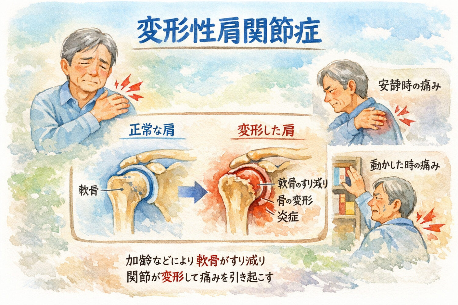 変形性肩関節症は、加齢や長年の使い過ぎ、過去のけがなどを背景に、肩関節の軟骨がすり減って関節が変形し、痛みや動かしにくさが出てくる病気と考えられています。