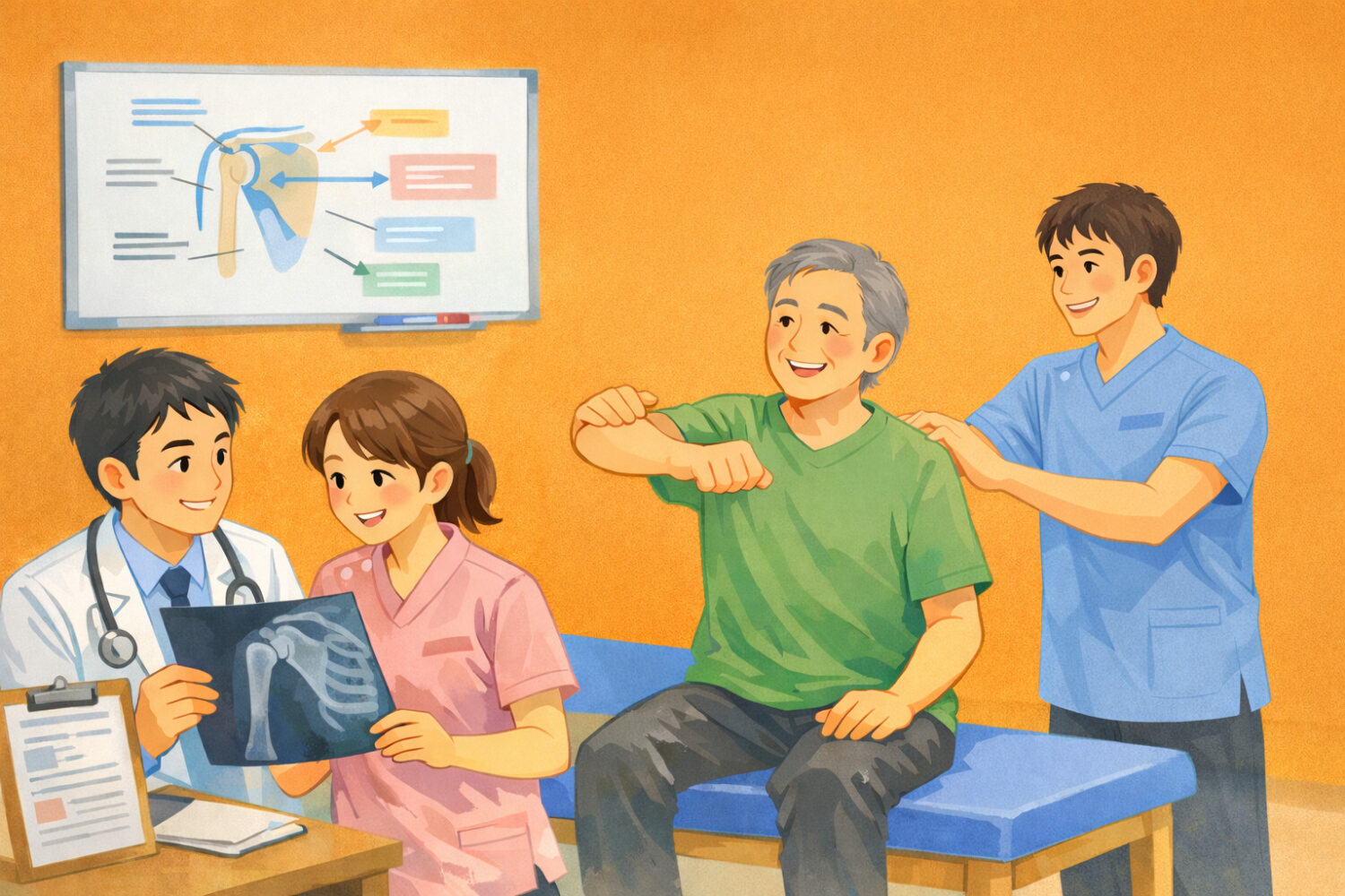 変形性肩関節症では理学療法士によるリハビリ(運動療法)が医学的にも重要です。薬や注射で痛みを落ち着かせながら、肩関節と肩甲骨の動き、姿勢、肩周囲筋の働きを整えることで、可動域の維持、日常動作の改善、痛みの再燃予防につなげます。当院では肩の治療経験が豊富な理学療法士が多数在籍し、医師の診察所見や治療方針と連動させてチームで情報共有しながら、一人ひとりに合わせたリハビリを提供しています。
