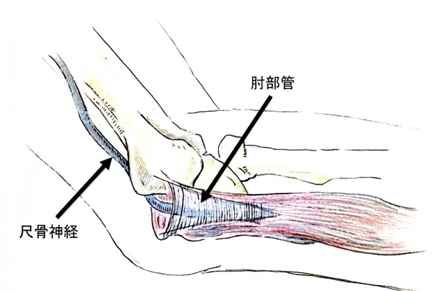 原因としては、肘部管が狭くなることで生じる慢性的な圧迫が中心で、Osborne(オズボーン)バンドによる締めつけや、肘関節の変形(骨棘など)を背景に発症することがあります。長期間の圧迫が続くと症状は徐々に進みやすく、安静や薬などの保存療法で十分に改善しない場合には、神経の圧迫を取り除く手術が検討されます。