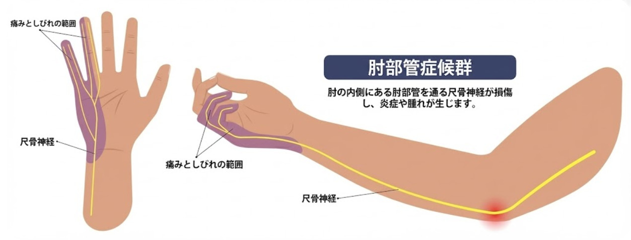 肘部管症候群(Cubital Tunnel Syndrome)は、肘の内側にある「肘部管(ちゅうぶかん)」というトンネル状の通り道が狭くなり、その中を走る尺骨神経が圧迫されて起こる病気です。尺骨神経は、肘から手にかけて小指・薬指の感覚や、手の筋肉の働き(握る、つまむ、指を動かすなど)を担っています。