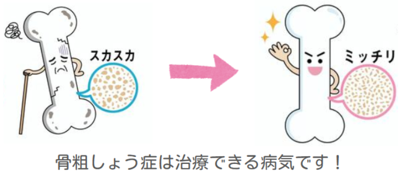 骨粗しょう症(Osteoporosis)は骨の量が減少し、骨の質が悪くなり、骨折しやすくなる疾患です。骨折するまであまり症状がなく、ある日突然、ささいなけがで骨折してしまいます。「身長が縮んできた」「背中が曲がってきた」「慢性的な腰痛が続いている」などの症状がある方は、骨粗しょう症による「いつの間にか骨折」を起こしている可能性があります。