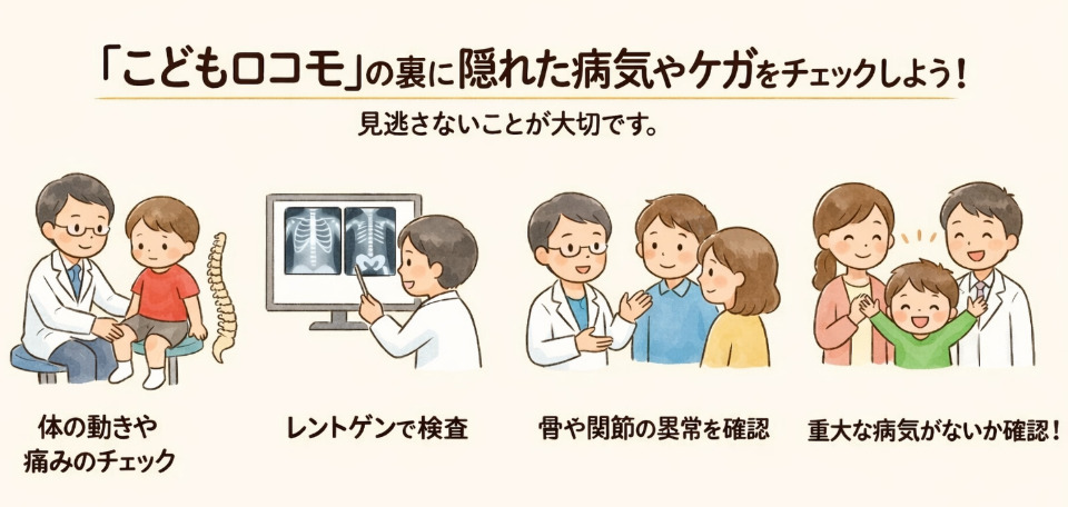 整形外科では診察によって全身の動きや左右差、痛みの有無を評価し、必要に応じてレントゲンなどの検査を行い、「重大な病気が隠れていない」ことをまず確認します。ご家族にとっても、「大きな問題がない」と分かるだけで不安が軽くなります