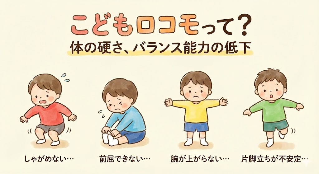 こどもロコモは、成長期の子どもで「体を動かす力(骨・関節・筋肉のはたらき)」が弱くなり、日常生活や体育の動きがうまくできなくなる状態を指します。体が硬くなったり、バランスが取りにくくなったりすることで、しゃがめない、前に曲げられない(前屈ができない)、腕が上がりにくい、片脚立ちがぐらぐらするといったサインが目立つようになります。このような状態が続くと転びやすくなったり、運動中のケガにつながりやすくなるため、早めに気づいて対策することが大切です。