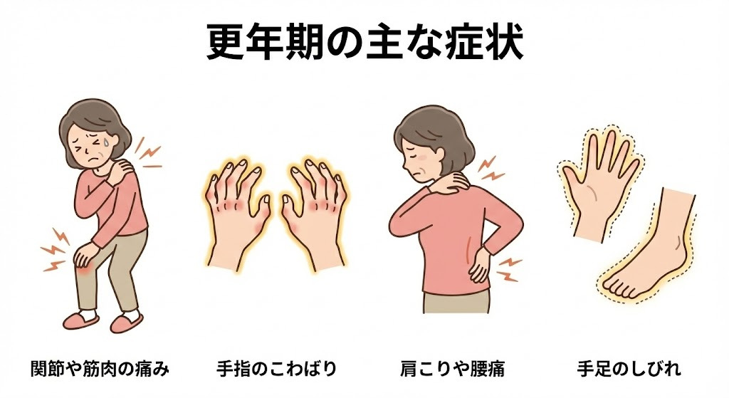 更年期の女性において、関節や筋肉の痛み、手指のこわばりは、肩こりや腰痛と並んで頻度の高い症状です。更年期後半では、約半数の方が関節の痛みがあるという報告もあり、手足のしびれを伴うことも少なくありません。