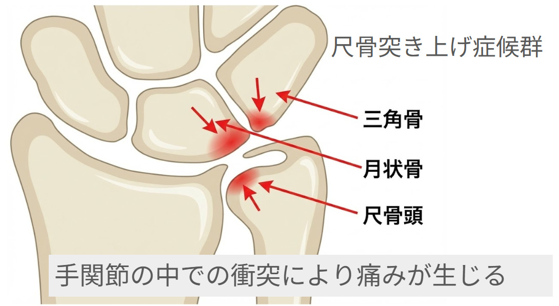 尺骨突き上げ症候群の原因は、手首の小指側の関節に、長い期間、「押しつける力(負担)」がかかり続けることです。つまり、尺骨と手首の骨(手根骨)が、くり返し強く当たることで、関節や周囲の組織が少しずつ傷んでいきます。
