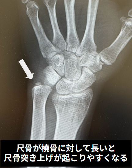 とくに大きな要因は、尺骨が相対的に長い状態(「尺骨プラス変異」といいます)です。尺骨が長いほど、小指側の関節に体重や力が集中しやすくなり、痛みや変性が起こりやすくなります。また、手首の骨の傾き(橈骨の角度)が変わることでも、小指側にかかる負担が増える場合があります。