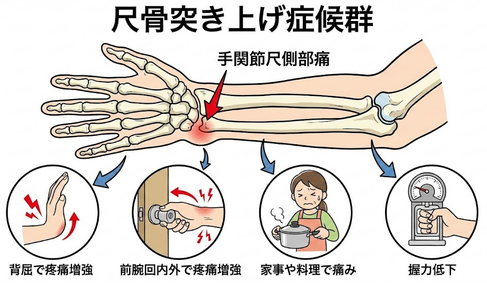 おもな症状は手関節尺側部痛(小指側の痛み)であり、手関節背屈や前腕の回内外で疼痛が増強しやすい点が特徴です。日常動作や作業時の痛みだけでなく、可動域低下、握力低下を自覚することもあります。手関節尺屈で疼痛が増強することが多く、疼痛が誘発される動作や負荷のかかる肢位が比較的はっきりしていることが多いとされます。