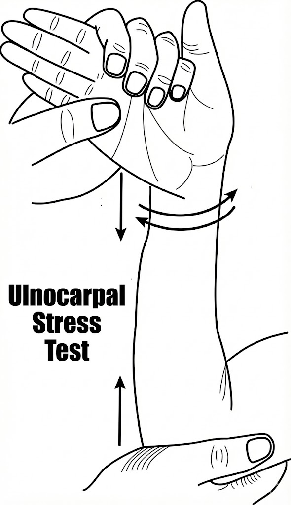尺骨突き上げ症候群(UIS)の診察では、まず手首の小指側(尺側)の痛みを確認します。代表的な「ulnocarpal stress test」で尺側の関節に軽く押しつける力を加え、痛みが再現されればUISを疑う手がかりになります。