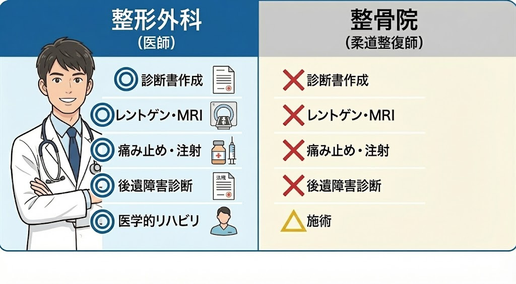 「医学的治療」「診断書の作成」「レントゲン・超音波による画像診断」「投薬・注射などの医療行為」は医師にのみ可能な医療行為で、整骨院・接骨院ではできません。